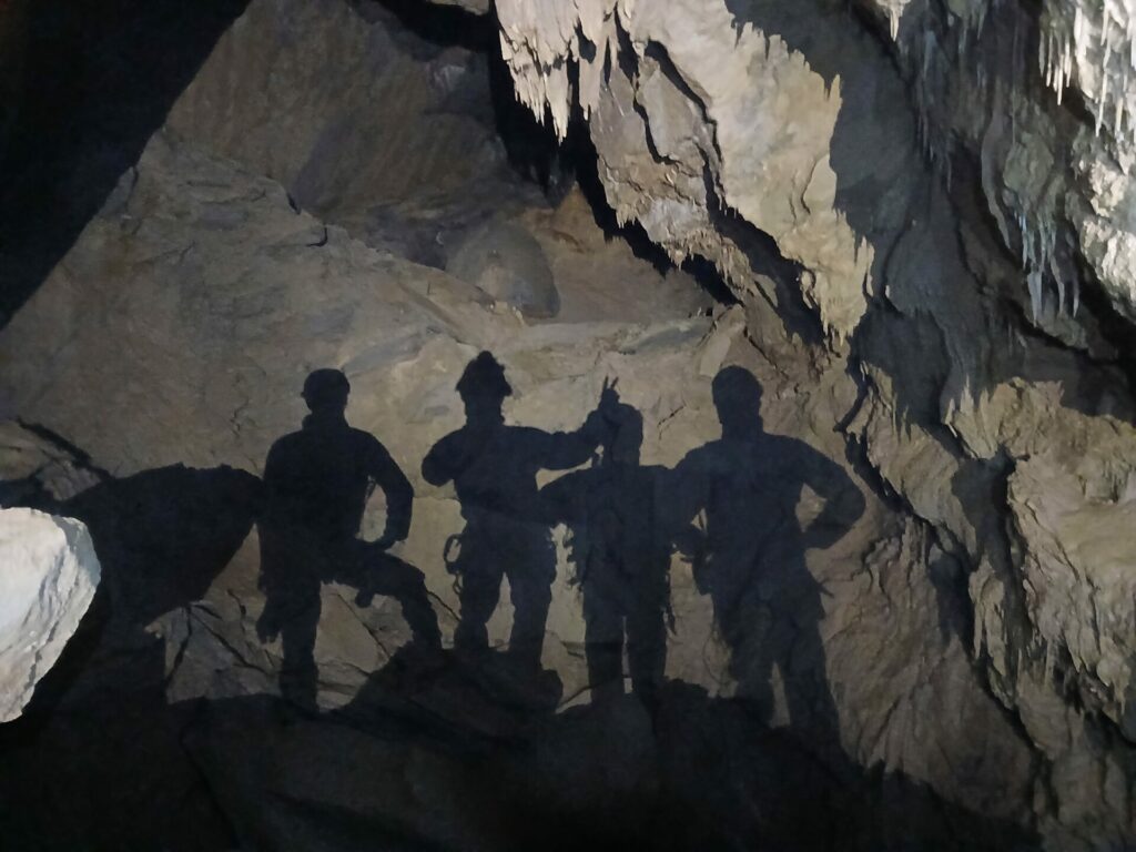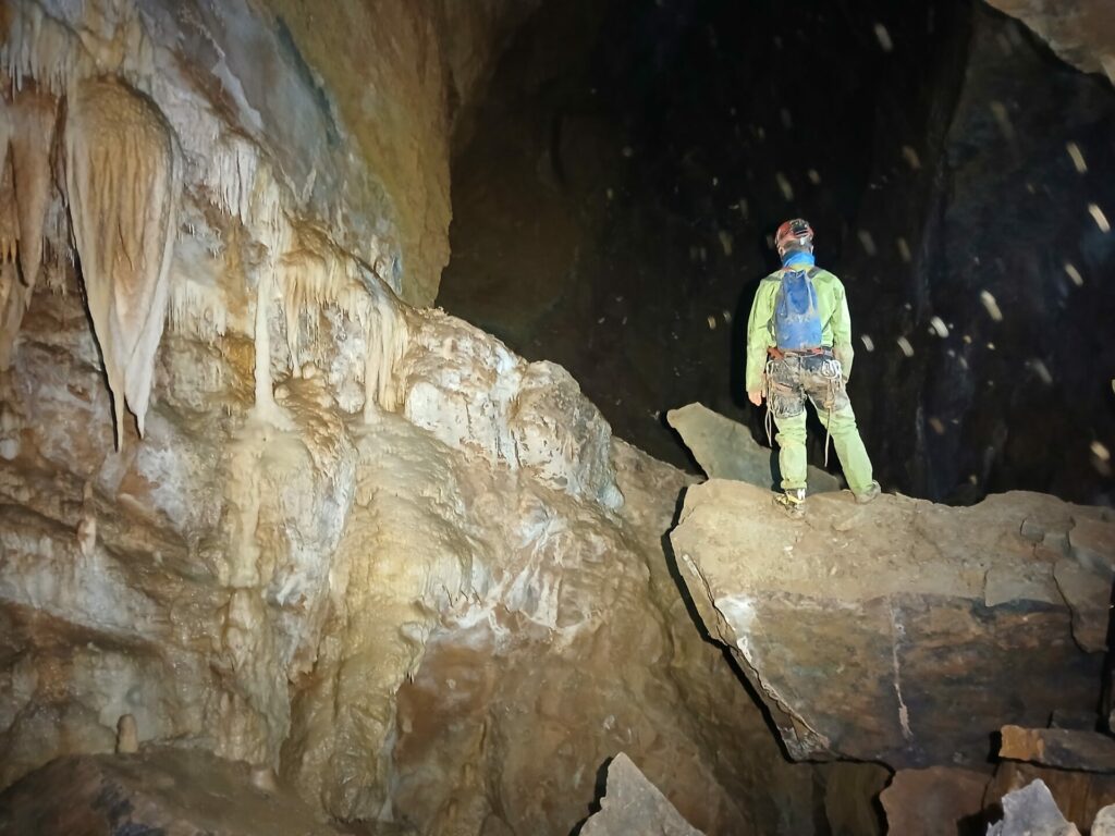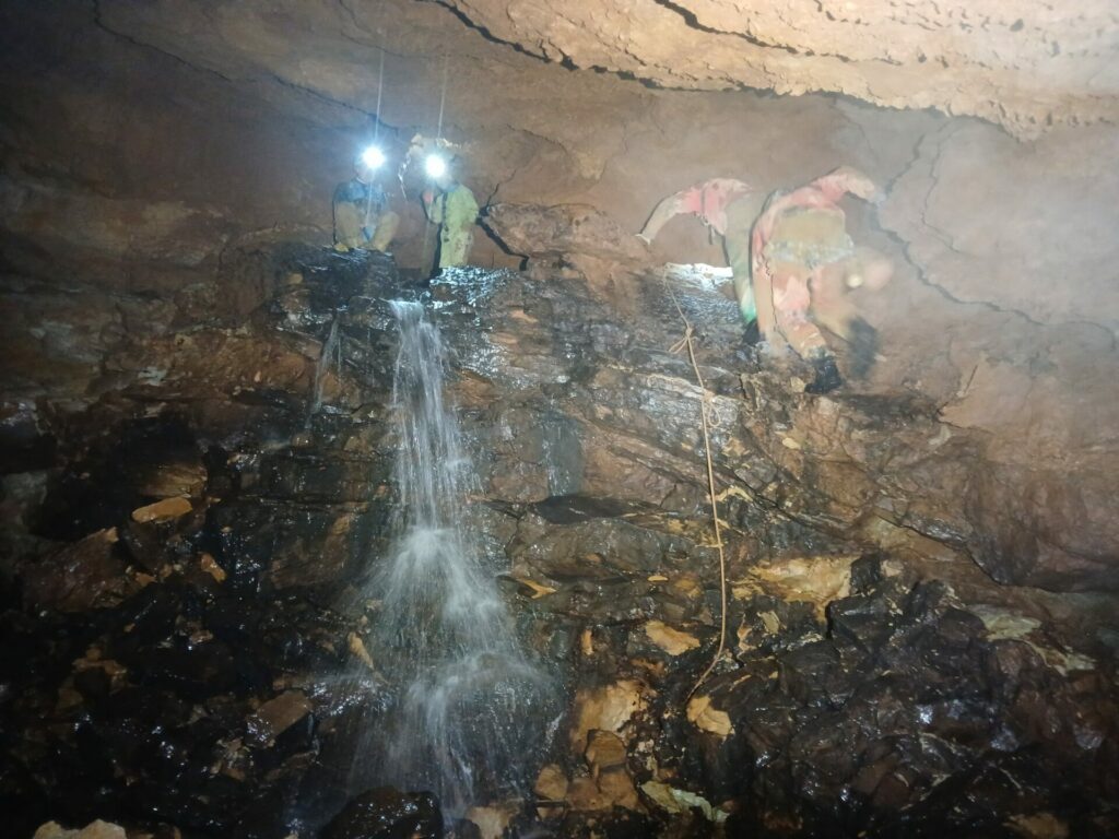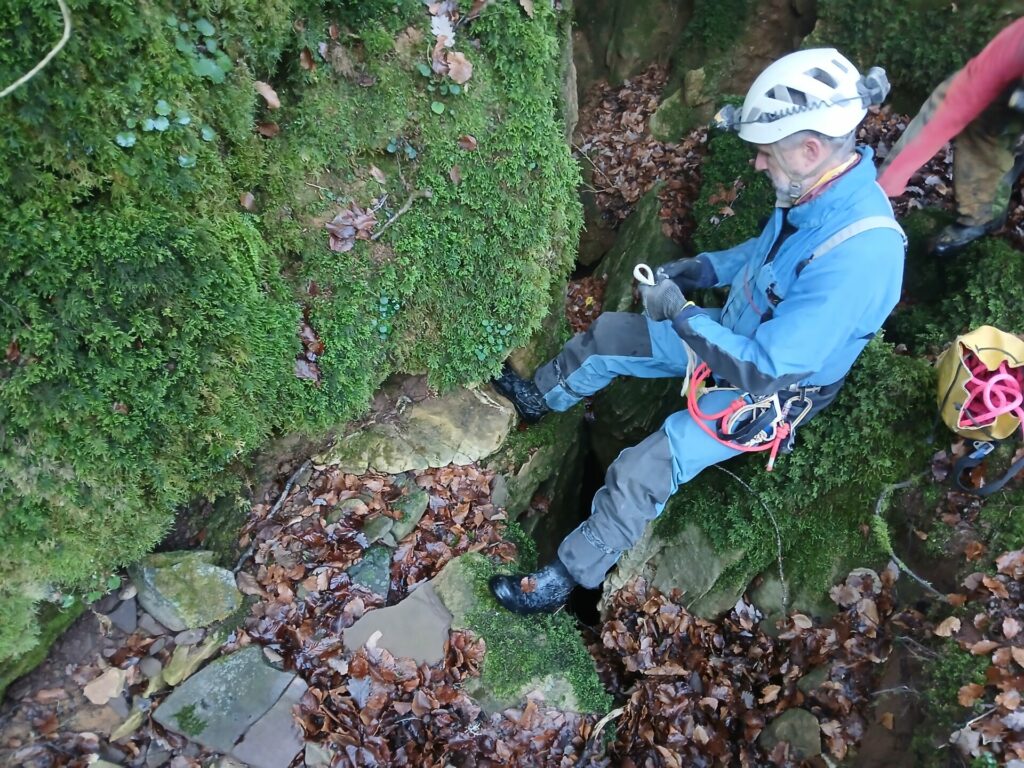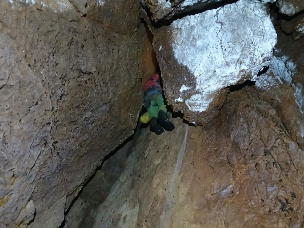 Alexis ouvre la marche, après 10 min, nous sommes au bord « du trou », un orifice étroit et vertical entre des blocs et c’est parti, le même spéléo équipe l’entrée, un ressaut de 3 m et tout le monde se retrouve au chaud.